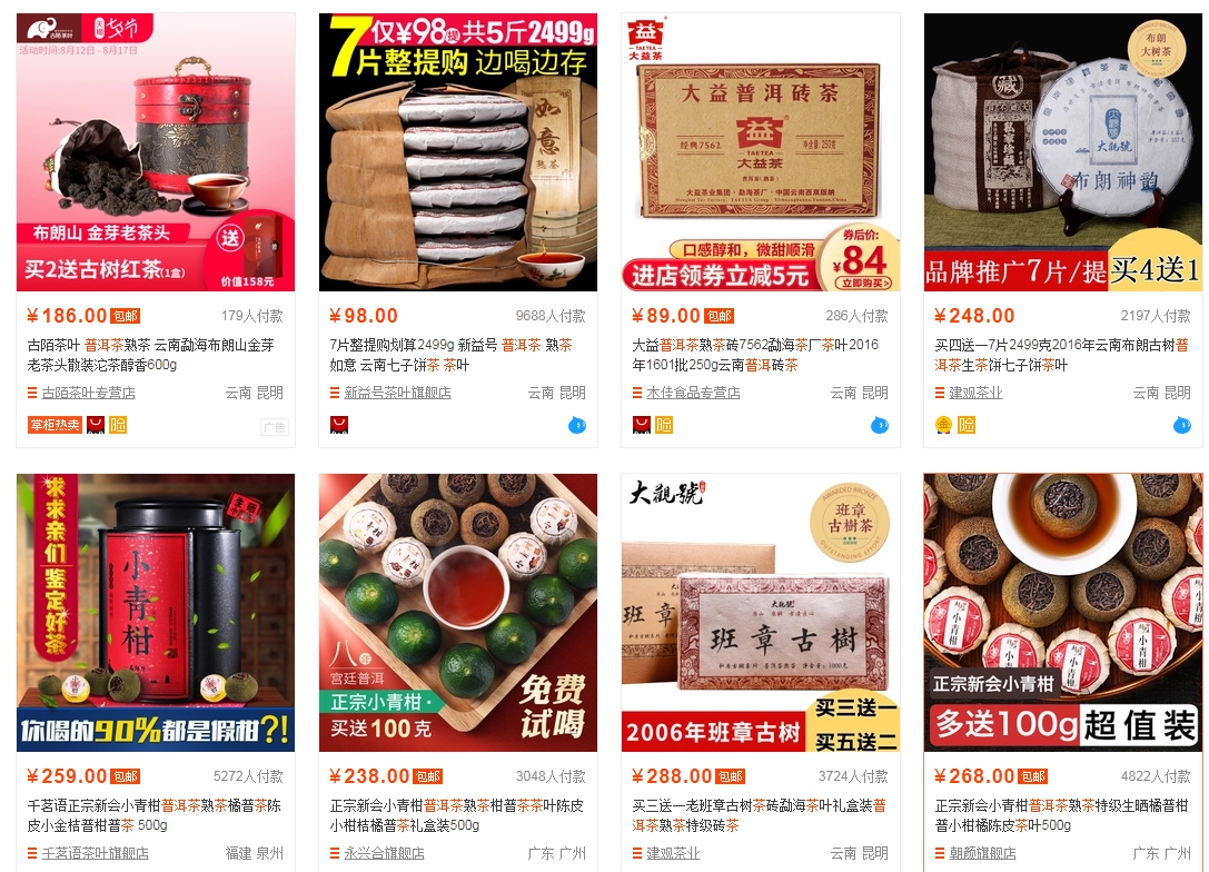 淘寶普洱茶賣場實況每年一到“雙十一”、“雙十二”這樣的電商購物節,電商平台上就會出現好多廉價爆款的熟茶,小沱茶9.9一斤買一送一,熟茶99一提,7餅包郵送到家。對於這樣的茶新茶客認為有便宜可佔,經常一買一大堆。